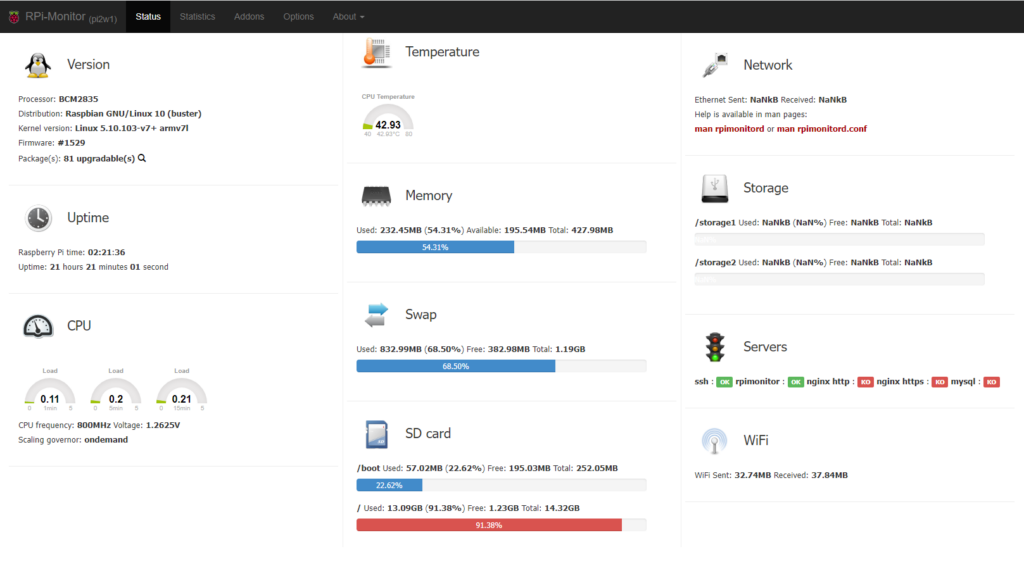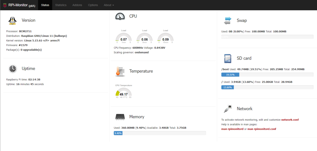 Cada vez que se cambie algún archivo de la configuración de Rpi Monitor es necesario reiniciar el servicio utilizando la orden sudo systemctl restart rpimonitor