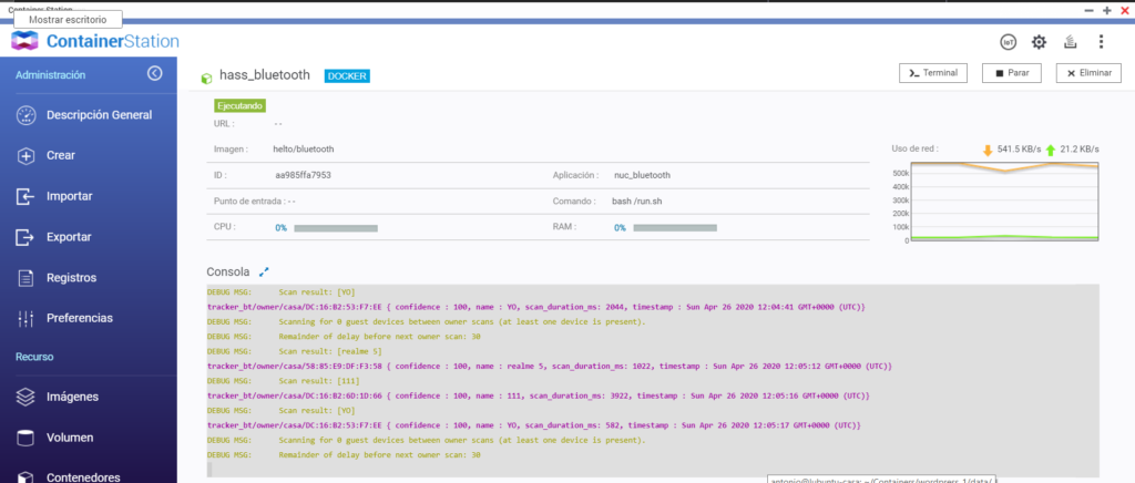 Una vez creado mediante docker logs hass_bluetooth –follow veremos los logs del docker para ver si ha arrancado correctamente