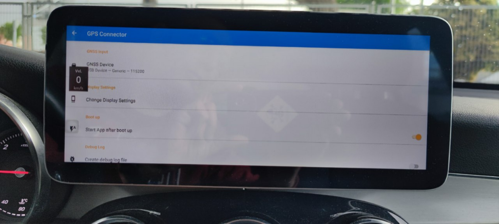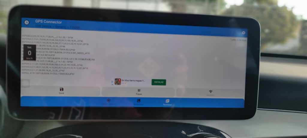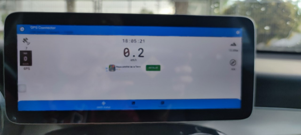 La parte mas importante además den numero de satélites a la vista es el margen calculado de error , en este caso es 4,7 mts , que es un valor muy bueno teniendo en cuenta que el GPS esta metido en un cofre del reposabrazos de la consola central y con el techo del coche impidiendo una señal a cielo directo , prueba superada.