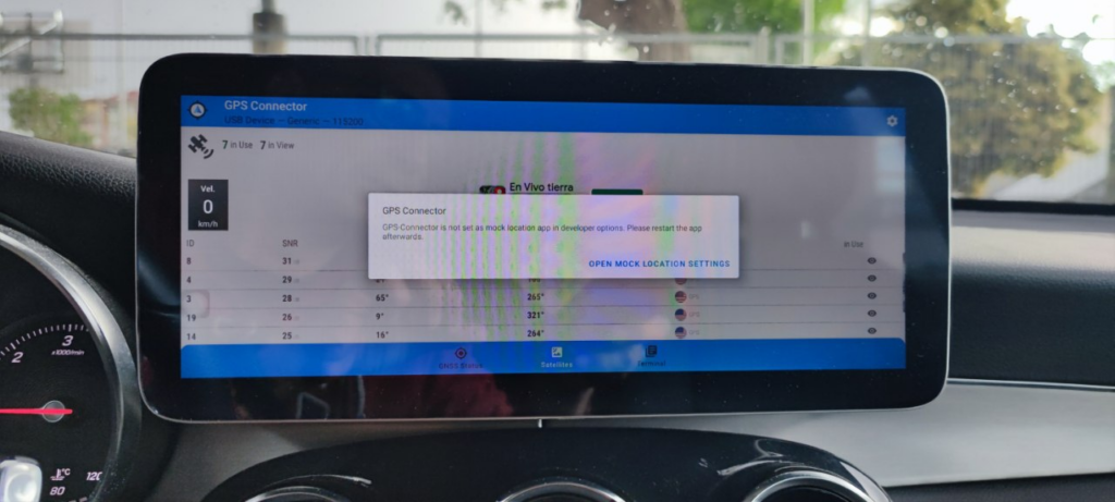 Al fondo ya vemos que nos esta cogiendo siete satélites y esta usando los siete para determinar nuestra ubicación , y también vemos un mensaje con lo que será la clave para integrarlo , nos dice que no esta seleccionado en la parte de opciones de desarrolladores / simulación de la ubicación.